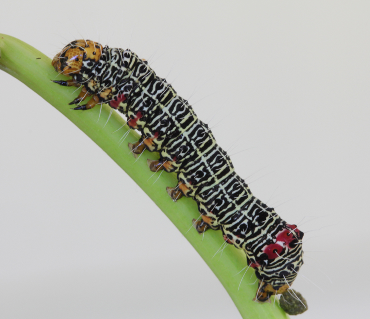 I mentioned to a friend that I wanted to take some shots of caterpillars, but could not find any in my garden…..(lucky me)…….this morning she gave me a small jar with two of these stripey ones in it.  It is the caterpillar of the Grapevine Moth, of which I posted a photo earlier.  I now have two of them living in a very large glass jar, on vine leaves, so you can look forward to seeing some more of them as they grow.