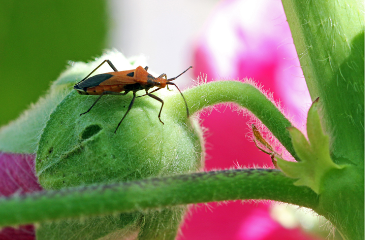 The Harlequin bug was sitting on a Hollyhock bud, so all those colours are true.