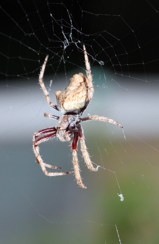 I ignore the majority of Spiders’ webs which adorn my house at this time of year, as I’m always looking for a good photo opportunity to take a picture of the resident Spider, or it’s prey.  This is one of the ladies which live near my backdoor, she is an orb weaver who usually comes out during the night.  Today she has been sitting in the middle of her now tatty web, catching various insects.  Her body is about half and inch long.