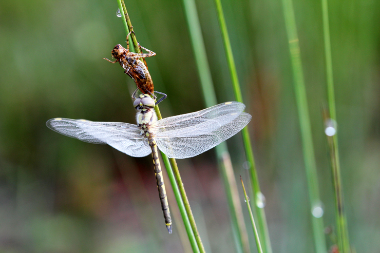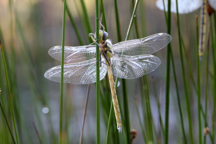 Today is warm…..and this morning in the early sun there were many newly emerged Dragonflies sitting on water reeds before their first flights…it was magic to watch as they opened their wings for the first time, sat for half an hour or so, then began to flex their legs and wings before beginning a whole body and wing tremor for another couple of minutes and then up and away…..I was not there early enough to see any emerge from the nymph shell and think this may happen before dawn. Perhaps tomorrow I shall go down with a torch and see if I can catch that happening. I hope you enjoy seeing these.