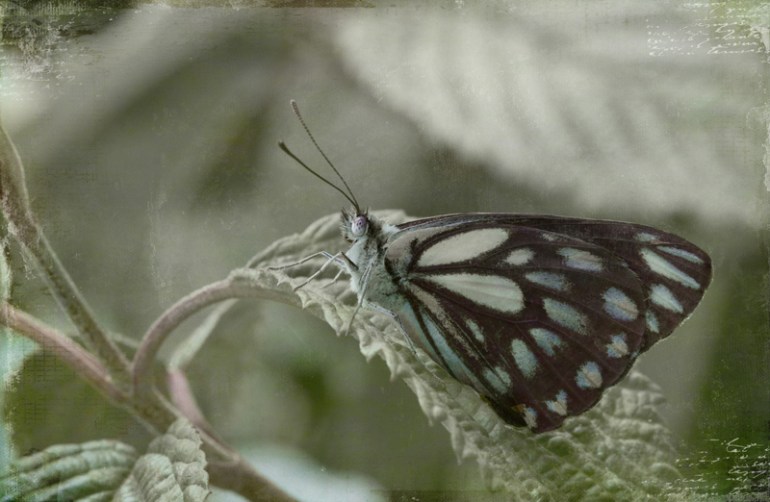 This butterfly was shot a couple of weeks ago, and although I have tried to identify it, I cannot.  It has the most unusual speckled blue eyes, and that was before I added any textures. This one has had several of Kim Klassen‘s textures added to it:- KK3, Fall in Love, Subtly Yours, and Blue Bayou………all at different blending modes and opacities.  To me it has a very cool and icy look, which is very different from the usual ones I do.