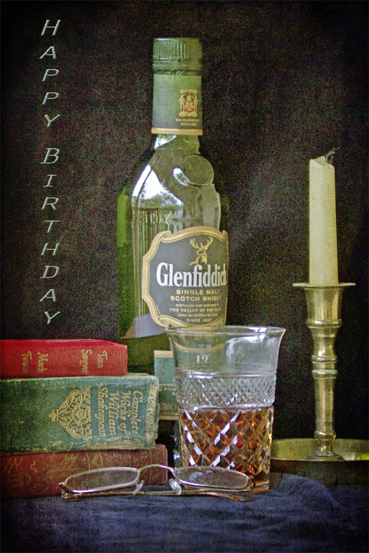 The Christmas season is almost upon us, and I am sure that most folk will do a Christmas themed image for this week’s topic…….I’m not much enthused about Christmas for a variety of reasons, so my image this week was made as a Birthday Card for a friend who celebrated his 77th birthday recently. I wanted a masculine looking card, and my gift to him was the bottle of Glenfiddich in the picture – not very original, but really what do you give a gentleman of this age, who already has just about everything he might need!