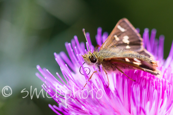 According to Wikipedia, Skippers are small butterflies, named for their darting and rapid flight, usually fairly close to the ground. They are of the family Hesperiidae and while they might look more like Moths due to their small size and dull colouring, they are not. Skippers are distinguished by their club like antennae, where moths have feathered ends to theirs. The gorgeous little butterflies have stocky bodies, and large compound eyes while their wings, which are small in proportion to their bodies, are usually angled upward or spread out while at rest. They are only 10 -15 mm in size, but my experience is that they stay on a flower for longer that other butterflies, and so are easier to photograph. I love their furry coats and faces – they are very cute.