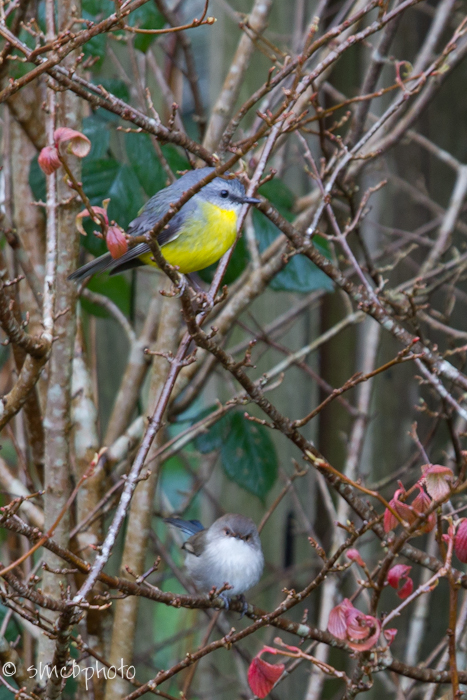 These tiny golf-ball sized birds are dowdy female Superb Fairy Wrens, while the yellow one is an Eastern Yellow Robin, a species I have only seen a couple of times in my garden.